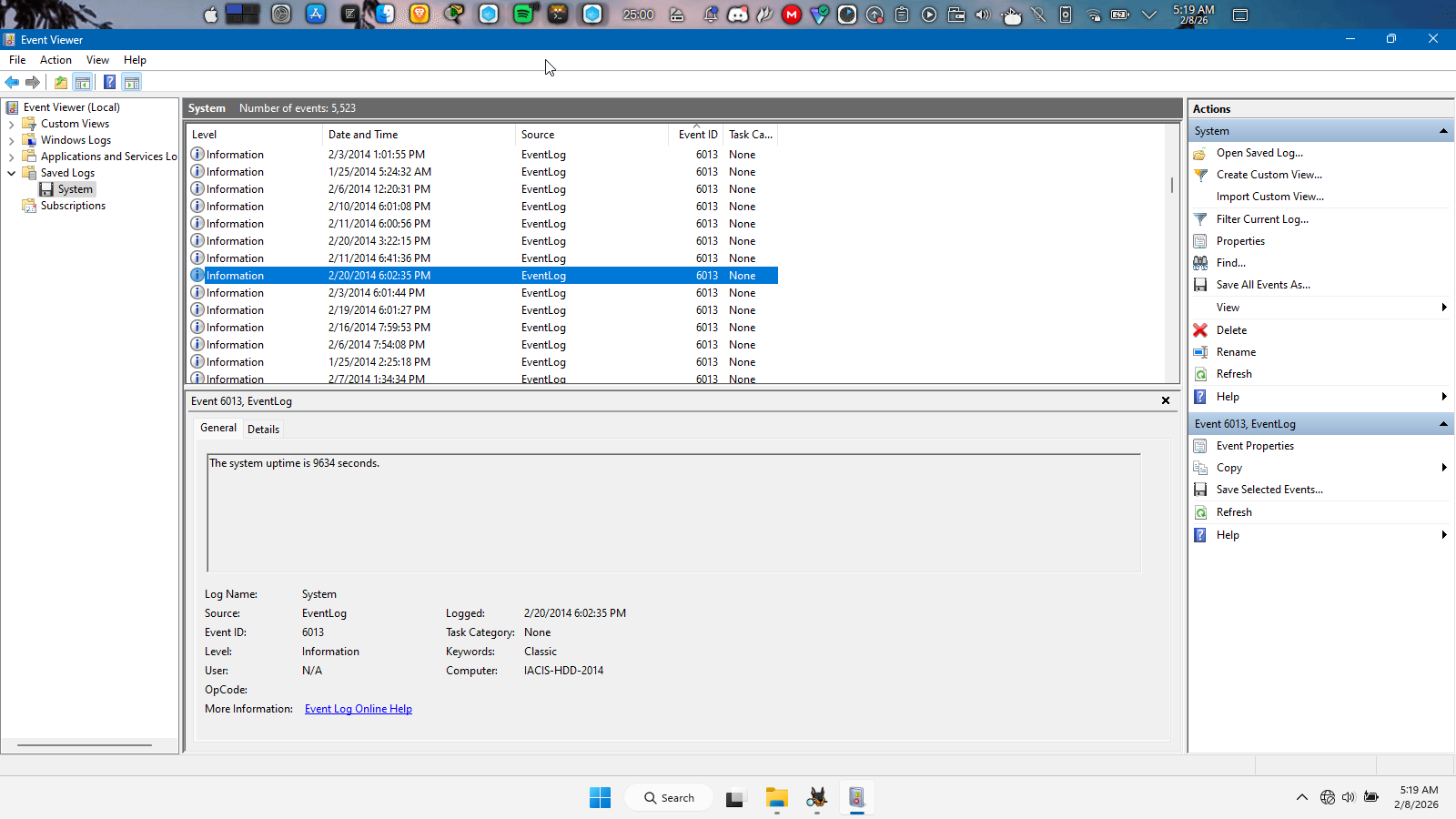seconds is: 9,634 To answer this question we have to first extract the windows event log file located at /Windows/System32/winevt/Logs/System.evtx You need a windows VM or Machine to complete this tasks after extracting file to your Windows host machine, then open the extracted file with windows event viewer