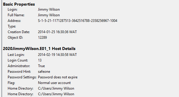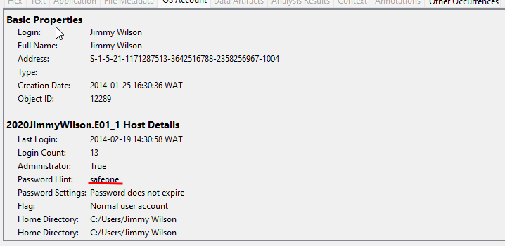 8. The user account Jimmy Wilson has his logon password enabled and the password hint is safeone.