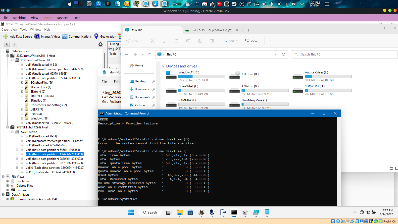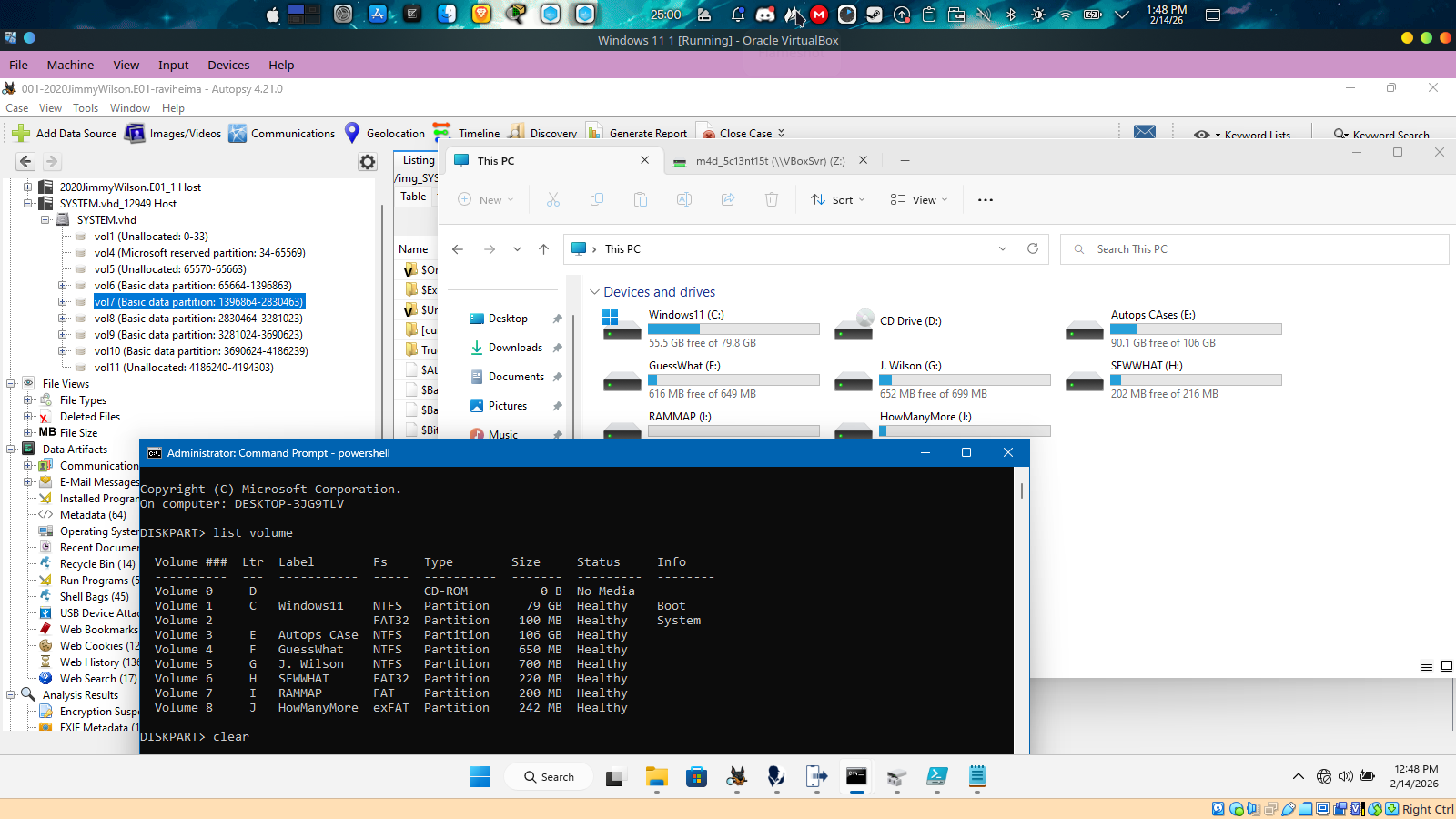 system.vhd located at /img_2020JimmyWilson.E01/vol_vol6/Windows/System32/config/SYSTEM.vhd then i doubled click on the system.vhd file to mount it after mounting it i found a couple of partitions with their label including the one labeled “J.wilson” using windows cmd diskpart list of commands i used