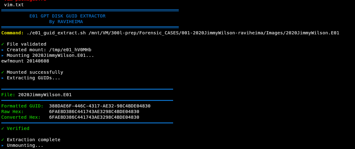 ewfmount /mnt/VM/300l-prep/Forensic_CASES/001-2020JimmyWilson-raviheima/Images/2020JimmyWilson.E01 ~/e01_mount