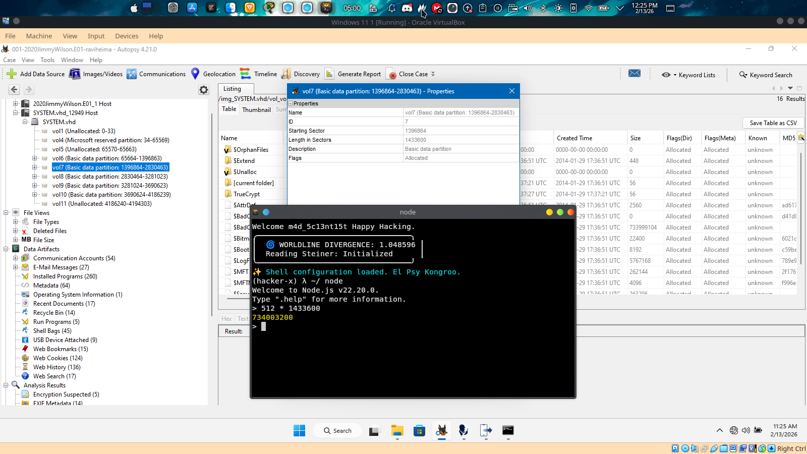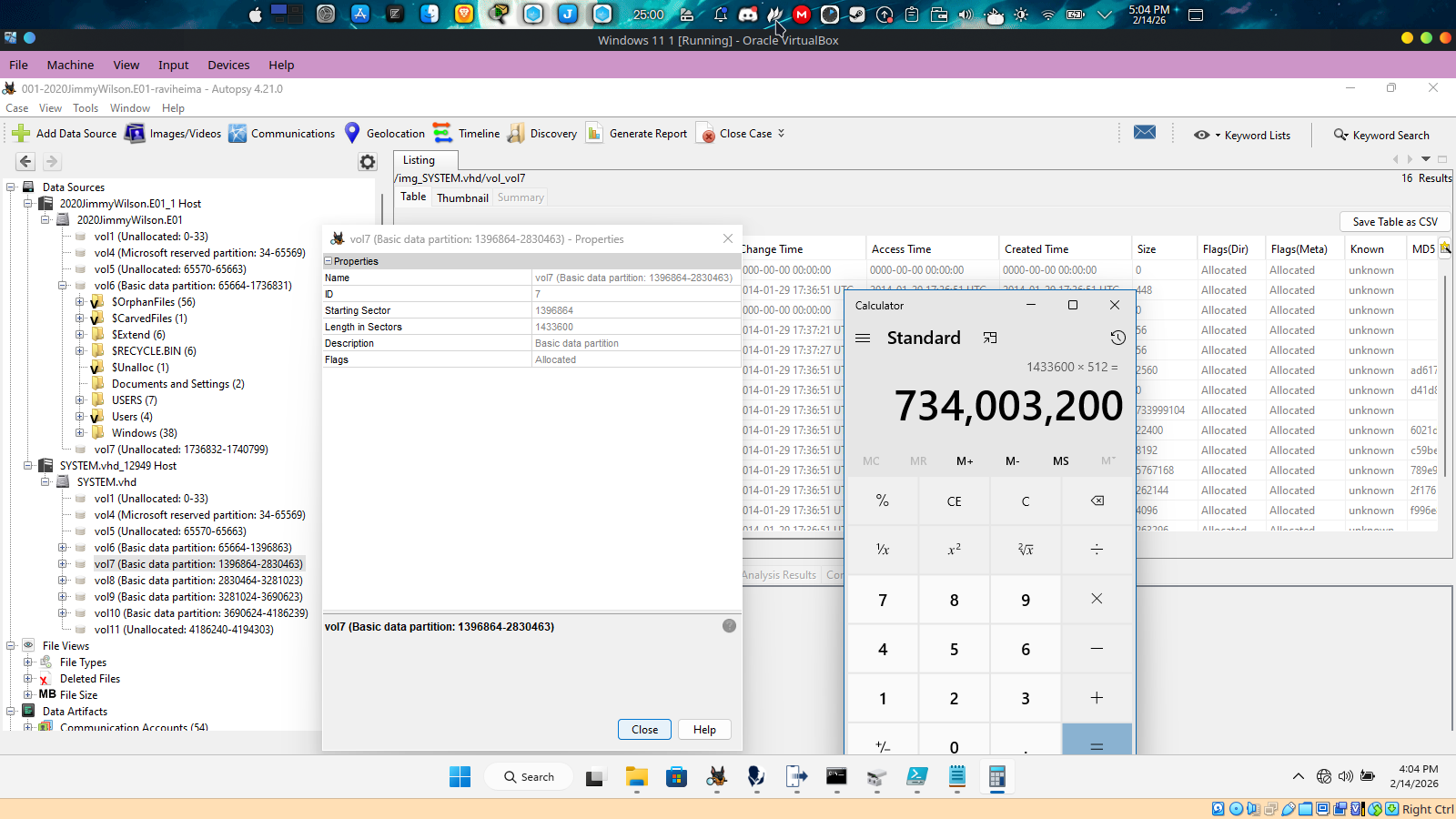i opened the J.wilson volume and it contains the truecrypt directory and in autopsy the volume containing truecrypt is vol7, so this is a solid evidence that vol7 is the vol with the label and to get the bytes in size we use the vol lenght in sectors which is 1433600 multiply it by 512 the product is 734,003,200
