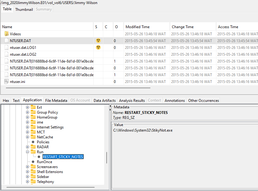computer? To find out we’ll open to registry located at /img_2020JimmyWilson.E01/vol_vol6/USERS/Jimmy Wilson/NTUSER.DAT Then navigate to Software → Microsoft → Windows → CurrentVersion → Run → RESTART_STICKY_NOTES
